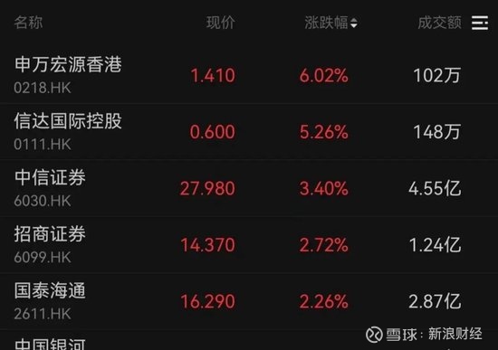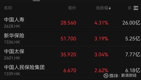 申万宏源涨超6%,信达国际、中信证券和招商证券分别上涨5.26%、3.40%、2.72%,中国人寿、新华保险、中国太保分别上涨4.31%、3.19%、3.04%。