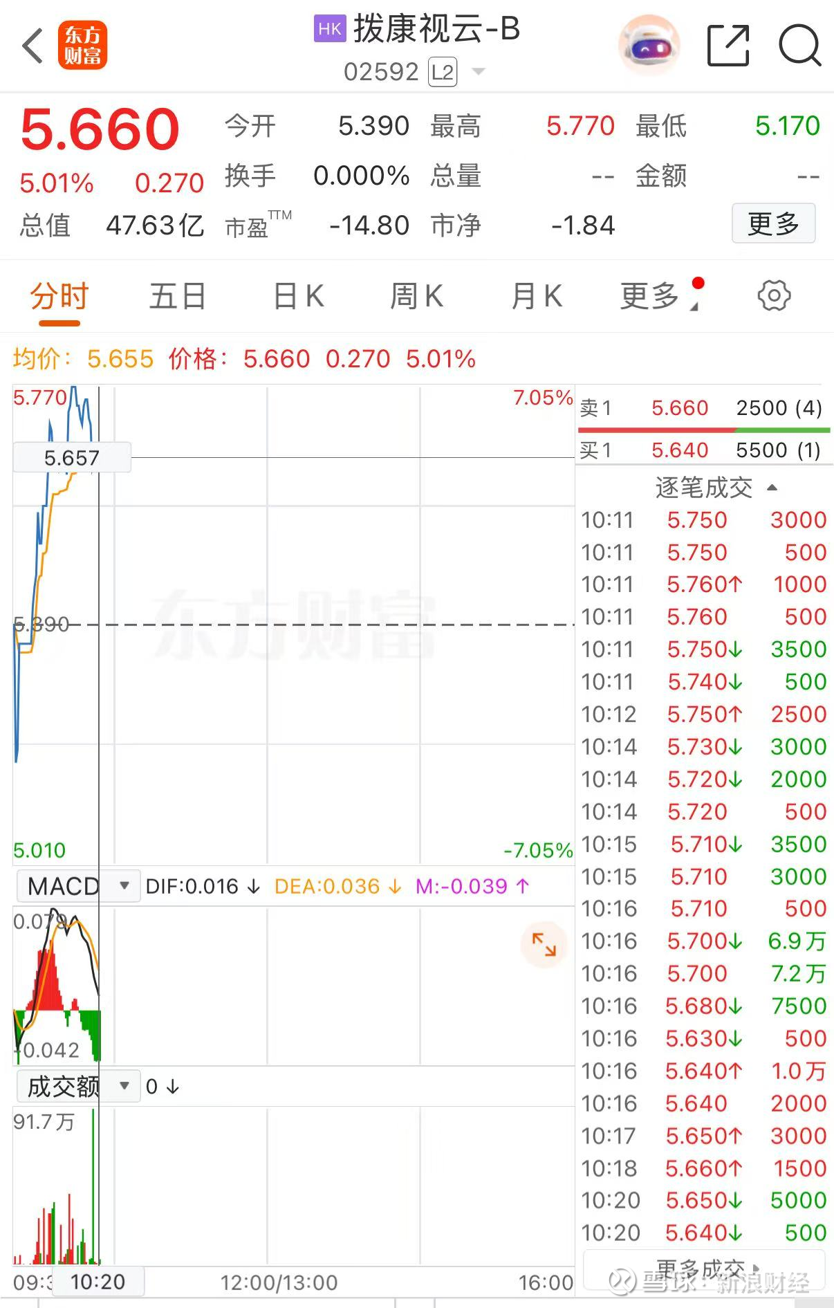 上证报中国证券网讯(林铭溱 记者 孔令仪)12月18日,拨康视云-B早盘一度涨超7%,最高报5.77港元/股。截至10时20分,拨康视云-B涨5.01%,报5.66港元/股,总市值约47.63亿港元。
