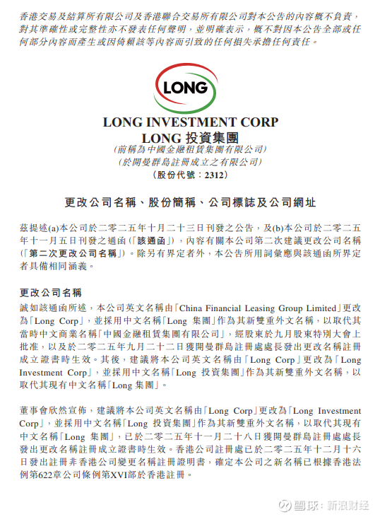12月18日金融一线消息,中国金融租赁发布公告,董事会宣布,建议将公司英文名称由“Long Corp”更改为“Long Investment Corp”,并采用中文名称“Long 投资集团”作为其新双重外文名称,以取代其现有中文名称“Long 集团”,已于2025年11月28日获开曼群岛注册处处长发出更改名称注册成立证书时生效。香港公司注册处已于2025年12月16日发出注册非香港公司变更名称注册证明书,确定公司的新名称已根据香港法例第622章公司条例第XVI部于香港注册。