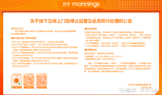 公告称,内地线下门店的最后营业日为2026年1月15日;而线上渠道则更早停止服务,官方商城小程序于12月28日停止运营,天猫、京东等第三方平台旗舰店则在12月26日便停止销售。