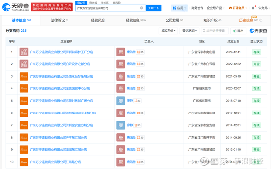 根据天眼查,截至发稿,万宁关联公司广东万宁连锁商业有限公司旗下的200多家分店大部分为注销状态,目前仍为开业或存续状态的分店仅有13家,主要位于广州、深圳、东莞、佛山和江门。