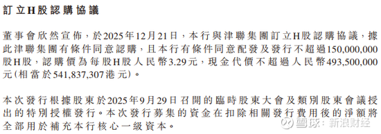 机构之家关注到,12月21日,威海银行于港交所发布公告,该行与津联集团订立H股认购协议,拟向津联集团发行不超过1.5亿股H股,认购价为每股H股人民币3.29元,较最新收盘价3.06港元溢价约17.97%,合计总额不超过人民币4.935亿元。