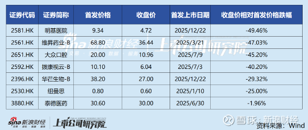 2025年初至今,港股已有24家生物医药公司成功上市,其中7家目前仍处于破发状态。拨康视云-B、大众口腔、维昇药业-B、明基医院收盘价(截至12月22日)相对首发价格跌幅超40%。