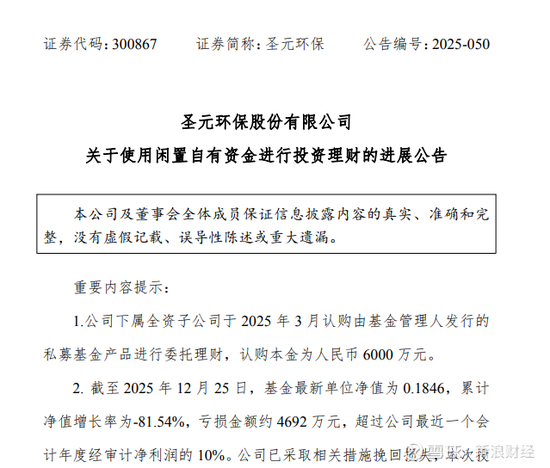 12月26日晚,圣元环保发布公告称,公司下属全资子公司厦门金陵基建筑工程有限公司(简称“厦门金陵基”)6000万元闲置资金认购的私募产品遭遇大幅亏损。截至12月25日,基金单位净值仅剩0.1846元,累计亏损达4692万元,亏损幅度高达81.54%,且亏损金额已超过公司最近一个会计年度经审计净利润的10%。