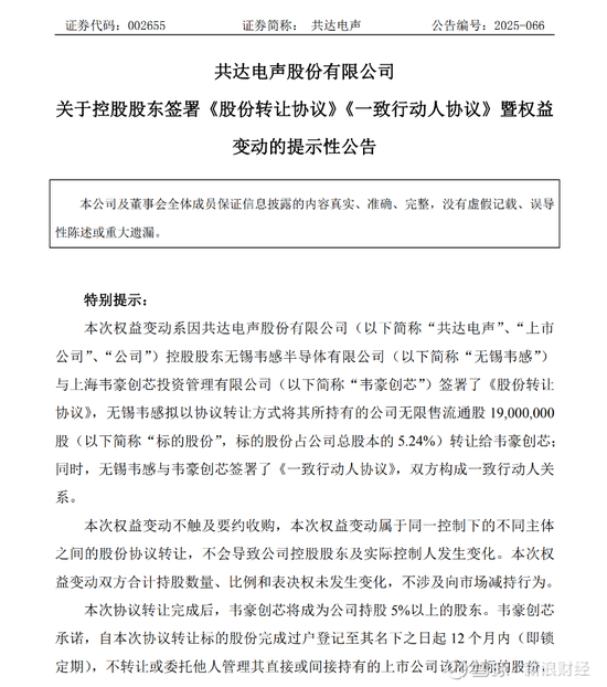 12月26日晚,共达电声(002655)发布公告,公司控股股东无锡韦感半导体有限公司(简称“无锡韦感”)拟将其持有的公司无限售流通股1900万股以12.03元/股的价格,协议转让给上海韦豪创芯投资管理有限公司(以下简称“韦豪创芯”),转让价款总额为2.29亿元。