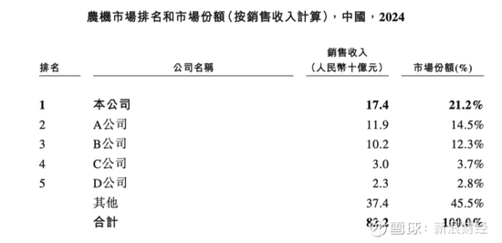 以2024年总收入174亿计算,占据中国农机行业21.2%的市场份额,排名第一,其中A公司为一拖股份(601038.SH)、B公司为沃得农机(也曾冲刺IPO但未上市),分别排名第二、第三,其他都是小公司。