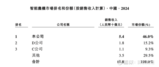 按照智能农机销售收入54亿计算,占据中国智能农机行业46%的市场份额,远超第二名。