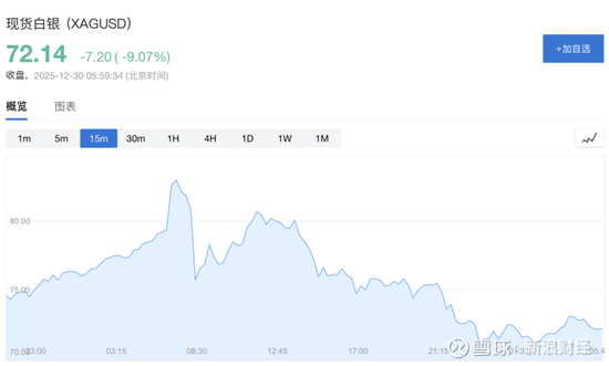 美东时间12月29日,以白银为首的贵金属全线重挫,截至收盘,COMEX黄金期货大跌4.45%,报4350.2美元/盎司;COMEX白银期货暴跌7.2%,报71.64美元/盎司;现货黄金大跌超4%,现货白银暴跌超9%,现货钯金暴跌超15%,现货铂金暴跌超14%。