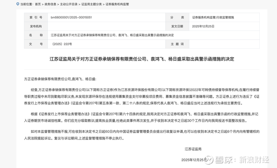 12月25日,江苏证监局披露2张罚单。其中一张直指方正证券承销保荐有限责任公司(以下简称方正证券)在持续督导工作中未尽到勤勉尽职义务,公司及两名保代袁鸿飞、杨日盛被出具警示函的行政监管措施;江苏京源环保股份有限公司(以下简称京源环保)被采取责令改正措施,公司董事长兼总经理李武林、副总经理季献华、董秘苏海娟、财务负责人钱烨被采取出具警示函措施。
