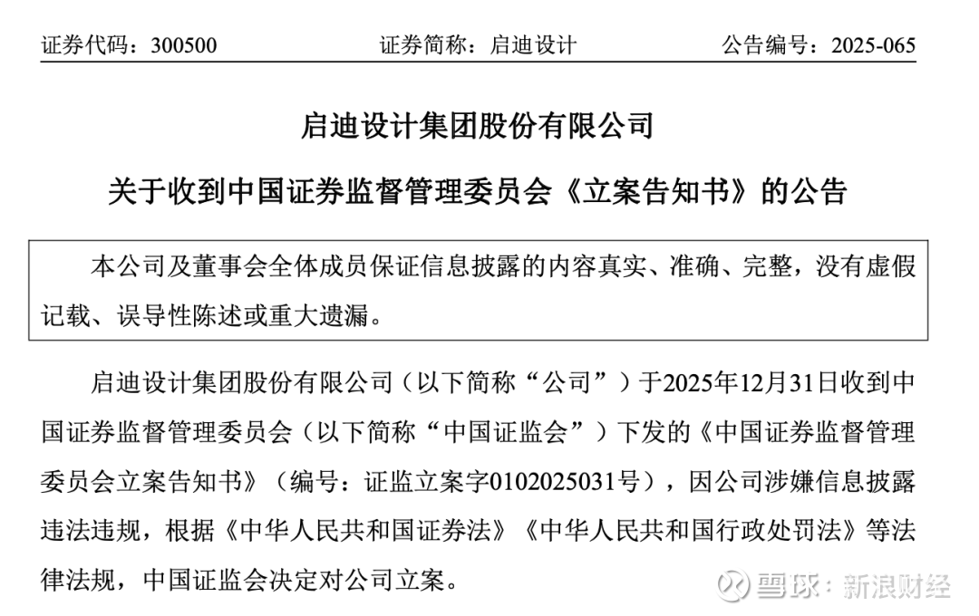 12月31日晚间,启迪设计(300500)公告称,公司于当日收到中国证监会下发的《立案告知书》,因公司涉嫌信息披露违法违规,中国证监会决定对公司立案。