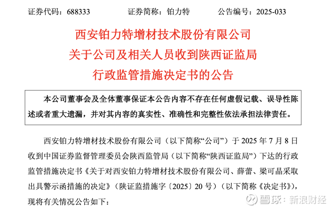 据此前公告,2025年7月,铂力特曾因财报出错收到陕西证监局下达的行政监管措施决定书。公告显示,铂力特因2025年4月披露的2024年年报和2025年一季报存在多处错误,陕西证监局决定对公司、董事长兼总经理薛蕾、财务总监梁可晶采取出具警示函的行政监管措施。