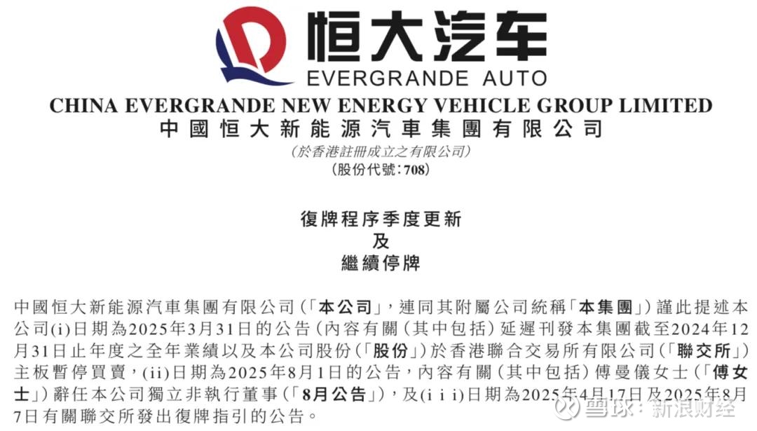 随后的3月31日,恒大汽车发布《内幕消息》,内容包括1、与相关附属公司有关的裁决更新;2、延迟刊发截至2024年12月31日止年度之年度业绩公告;3、暂停交易。到了6月,恒大汽车宣布因继续面临流动性问题,2024年财报发布日期无法确定,同时股票自4月1日起停牌的状态将无限期延长。此后恒大汽车股份一直处于停牌状态。而在此次公告中,恒大汽车再次强调,应公司要求,股份已于2025年4月1日上午九时正起暂停于联交所主板买卖,并将继续暂停,直至进一步通知为止。