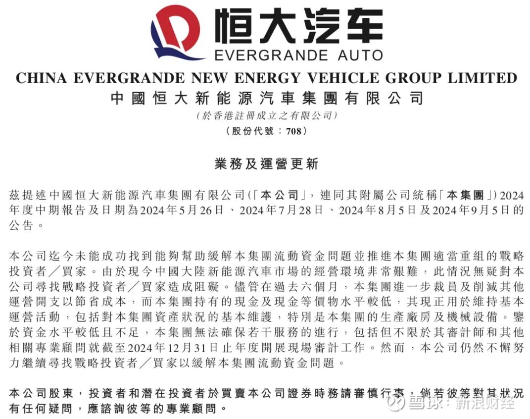由未能在限期内发布2024年度业绩,自2025年4月1日上午9时起,恒大汽车股份已暂停买卖,此后恒大汽车多次公告继续停牌,复牌时间无法确定。最早在今年2月初,恒大汽车表示,迄今未能成功找到能够帮助缓解集团流动资金问题并推进集团适当重组的战略投资者或买家。同时指出,因资金水平较低且不足,集团无法确保若干服务的进行,包括但不限于其审计师和其他相关专业顾问就截至2024年12月31日止年度开展现场审计工作。彼时,恒大汽车解释:“当前中国大陆新能源汽车的经营环境非常艰难,对公司寻找战略投资者或买家造成阻碍”。