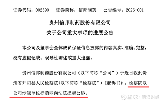 信邦制药(002390)1月6日公告,公司于近日收到贵州省开阳县人民检察院(简称“检察院”)《起诉书》,检察院以公司涉嫌单位行贿罪向法院提起公诉。