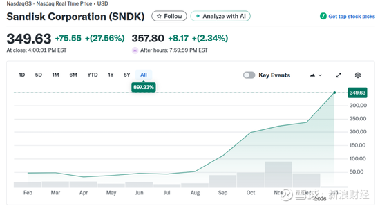 周二,闪迪(SanDisk Corp.,SNDK)的股价疯狂飙升近28%,报349.63美元/股,再度创下历史新高,自去年2月份以来已经暴涨10倍,总市值达到512.4亿美元。