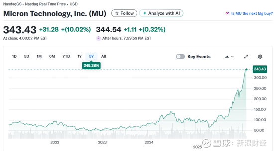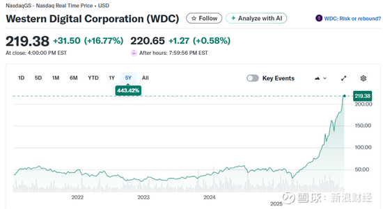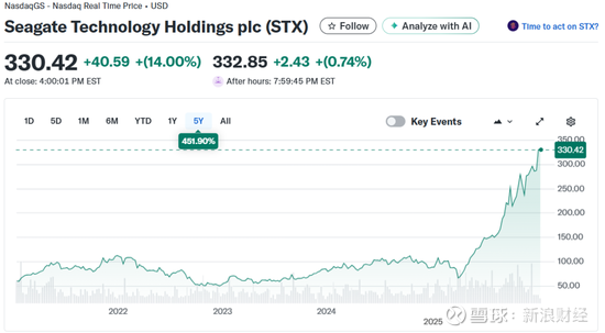 其中,西部数据上涨16.77%,报219.38美元/股,总市值750.1亿美元,自去年4月以来涨幅已近700%;希捷科技上涨14%,报330.42美元/股,总市值705.6亿美元,自去年4月以来涨幅已超过400%;美光科技上涨10%,报343.43美元/股,总市值3865亿美元,自去年4月以来涨幅也超过400%。