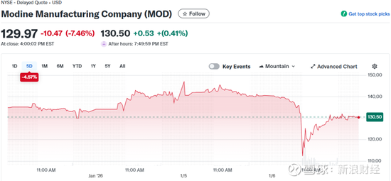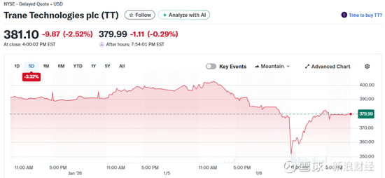 生产水冷式冷水机组及类似系统的江森自控国际公司(Johnson Controls International Plc,JCI)股价从前期高点处断崖式下跌6.24%,盘中最高跌超10%,创下7月以来最大单日跌幅,总市值696.4亿美元。摩丁制造公司(Modine Manufacturing Co.,MOD)股价收跌7.46%,盘中最高跌超20%,总市值68.43亿美元。特灵科技公司(Trane Technologies Plc,TT)股价下跌2.52%,盘中最高跌超10%,总市值845亿美元。