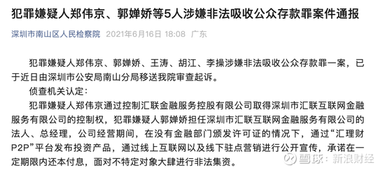 截图来源:官方公众号信息 2021年6月16日,深圳市南山区人民检察院官方微信发布消息,称犯罪嫌疑人郑伟京、郭婵娇等五人涉嫌非法吸收公众存款罪一案,已于近日由深圳市公安局南山分局移送检方审查起诉。