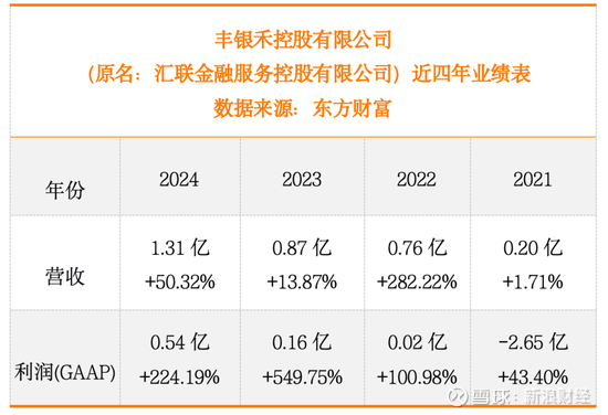 根据东方财富网的信息,2021年-2024年,丰银禾控股的净利润分别为-2.65亿元、0.02亿元、0.16亿元和0.54亿元,增速分别高达43.40%、100.98%、549.75%和224.19%。