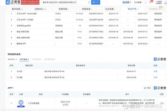此外还有APP仁天花极速版(简介自称购买新鲜食材的互联网购物平台上架,2023年12月被下架)、分期快小程序;以及全业贷、快点救急、金薪玖贷、盛财易贷、商银直贷、鼎盛车贷等六个贷款公众号。