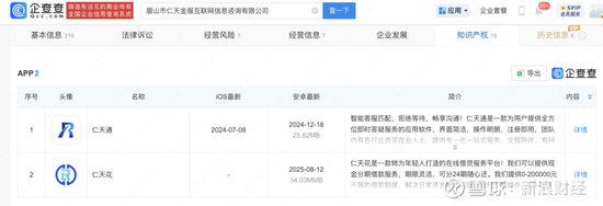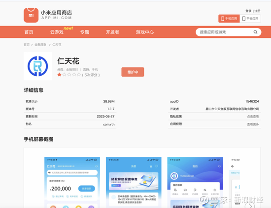 小米应用商店显示,仁天花更新时间为2025年8月27日,运营方为眉山市仁天金服互联网信息咨询有限公司。目前该APP显示“维护中”。值得注意的是,该公司不具备任何金融牌照。