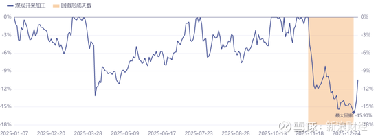 从中期行业周期看,煤炭行业在过去一年经历了艰难的时刻。2025年上半年的“以量补价”并未奏效,行业利润同比大幅下滑。尽管下半年在政策调节下有所改善,但进程充满波折。市场心态在悲观与试探性乐观之间反复。A股煤炭开采加工指数自2025年11月中旬起经历了一轮调整,持续约44天,最大回撤幅度接近16%。
