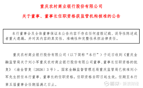 1月8日,重庆农商行发布公告称,近日收到批复,重庆金融监管局已核准刘小军担任该行董事、董事长的任职资格,任职资格自即日起生效,任期至第五届董事会任期届满之日止。