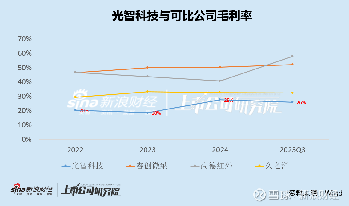 数据显示,近几年来,光智科技毛利率在18%至28%之间波动,显著低于睿创微纳、高德红外、久之洋等部分可比公司。此外,2025年前三季度,公司毛利率为26%,相较2024年仍在下滑。