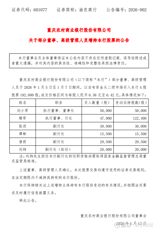 1月12日金融一线消息,渝农商行公告,部分董事及高级管理人员于2026年1月5日至1月7日以自有资金从二级市场合计增持本行A股股票19.2万股,成交价格区间为每股人民币6.36元至6.42元。其中,刘小军买入50000股,隋军买入47000股,张进买入30000股,谭彬买入15500股,唐莉买入29500股,刘祎买入20000股。上述人员确认在法定期限内不减持其持有股份,本行将持续关注并依法披露相关信息。
