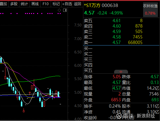 在此消息影响下,1月14日上午该股一字跌停。截至上午收盘,*ST万方报4.57元/股,下跌4.99%,封单超66万手。