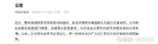 对此,携程表示:公司将积极配合监管部门调查,全面落实监管要求,与行业各方携手共建可持续发展的市场环境。目前,公司各项业务均正常运行,将一如既往地为广大用户和合作伙伴提供优质的服务。