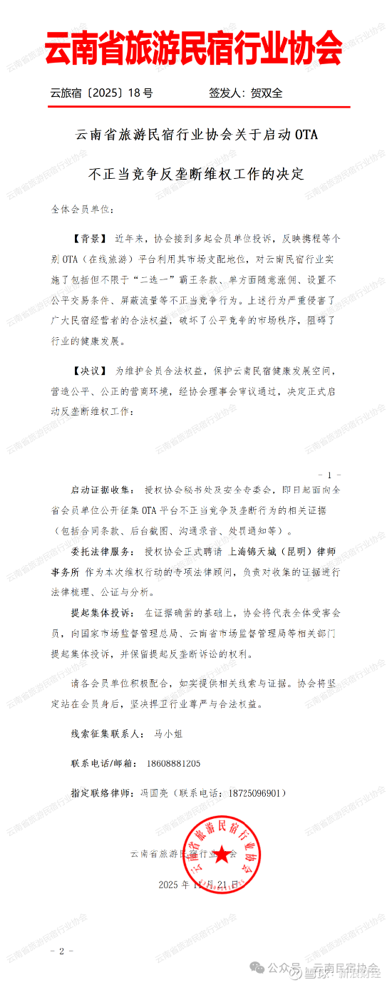云南省旅游民宿行业协会强调,将宣布将针对携程等在线旅游平台(OTA)涉嫌滥用市场支配地位的行为发起集体维权,同时启动证据收集、提起集体投诉、委托法律服务等多项举措。