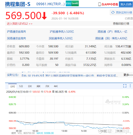 盘面上,或受此消息影响,携程港股尾盘直线下跌,截至收盘报569.5港元/股,跌6.49%。