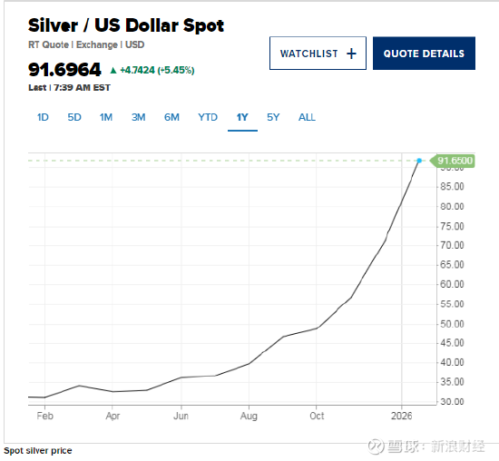 现货白银去年以 150% 的年度涨幅跑赢黄金,并在周二首次突破每盎司 90 美元。截至美国东部时间周三 05:42,现货白银价格上涨逾 4%,报每盎司 90.55 美元。