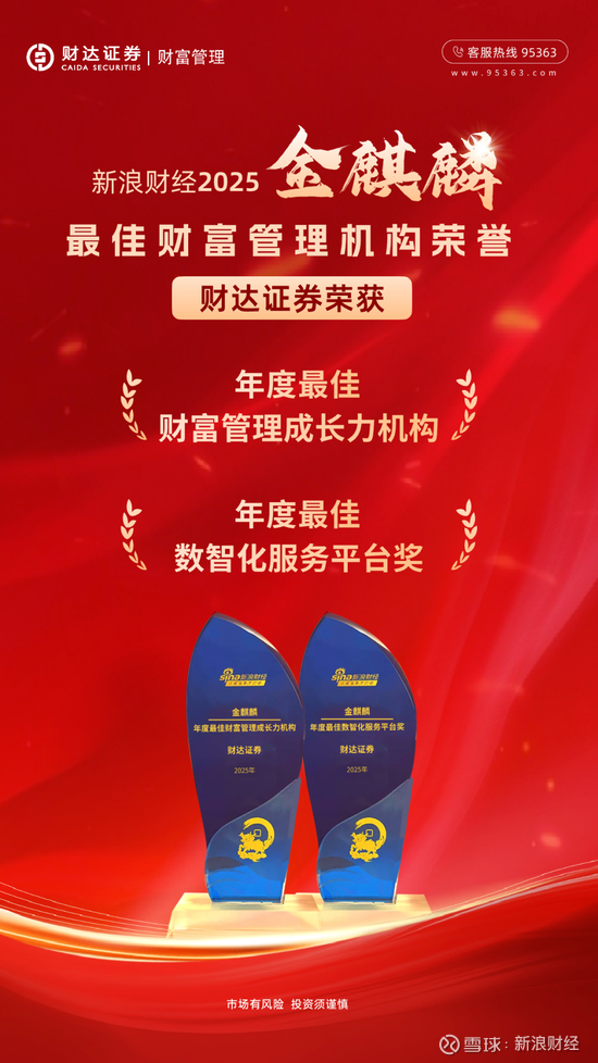 1月15日,新浪财经在北京举办的“2026全球与中国资本市场展望论坛暨金麒麟最佳财富管理机构、最佳投资顾问盛典”上,揭晓金麒麟最佳财富管理机构评选结果。财达证券凭借在财富管理领域的卓越表现,荣获 “年度最佳财富管理成长力机构”和 “年度最佳数智化服务平台奖” 两项大奖,彰显公司在财富管理转型中的专业实力与行业影响力。