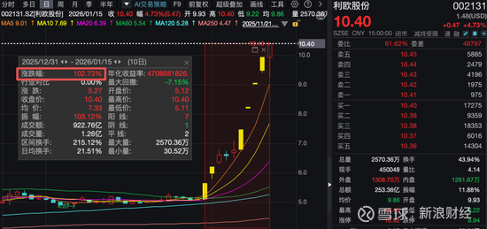 近期AI应用板块持续爆发,利欧股份成为本轮行情中资金追捧的“香饽饽”。截至1月15日收盘,利欧股份报收于10.4元/股。2025年12月31日至2026年1月15日,利欧股份股价累计上涨102.73%。