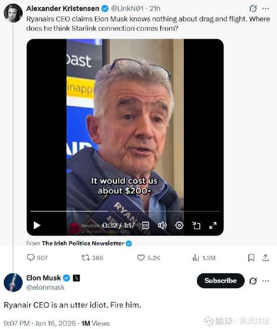 马斯克回应称,“瑞安航空CEO是个十足的白痴。解雇他!”