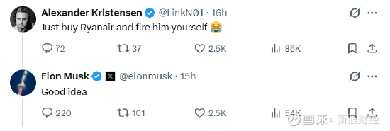 有网友随后在帖子下评论称,“收购瑞安航空,然后你自己解雇他。”对此,马斯克回复称,“好主意!”