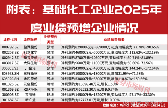 整体来看,目前业绩预增的化工企业多集中于化肥、农药板块,叠加2025年四季度磷化工、锂化工板块走强,企业相关产品量价齐升,驱动业绩增长。譬如,盐湖股份表示,氯化钾产品价格同比上升、碳酸锂产品价格在2025年下半年逐步回暖,带动公司业绩增长。净利润预增下限达50.6%的大洋生物也表示,业绩增长的主要原因系公司核心产品碳酸钾及兽用原料药业务实现量价齐升的良好发展态势。