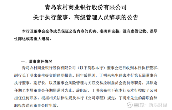 1月19日,青农商行(002958.SZ)对外公告称,公司董事会近日收到执行董事、副行长丁明来提交的辞职报告。因年龄原因,丁明来辞去公司第五届董事会执行董事、副行长,以及董事会风险管理与关联交易控制委员会委员等职务,其原定任期至本届董事会任期届满时为止。辞职后,其不在公司及公司控股子公司担任任何职务。