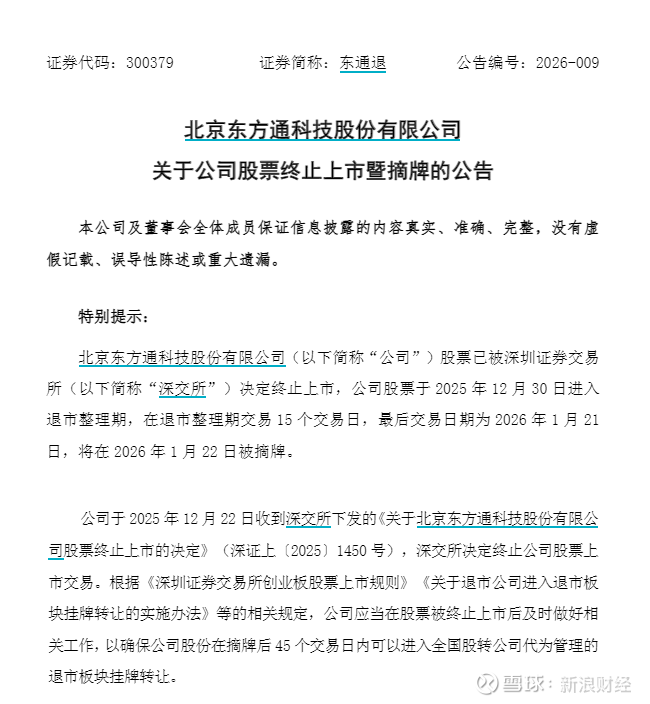 2025年12月22日,东方通收到深交所下发的《关于北京东方通科技股份有限公司股票终止上市的决定》,深交所决定终止公司股票上市交易。根据相关规定,公司股票于2025年12月30日起进入退市整理期交易。