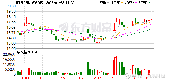 越剑智能股价创出历史新高,截至11:26,该股上涨9.24%,股价报19.50元,成交量754.38万股,成交金额1.40亿元,换手率2.92%,该股最新A股总市值达50.36亿元,该股A股流通市值50.36亿元。