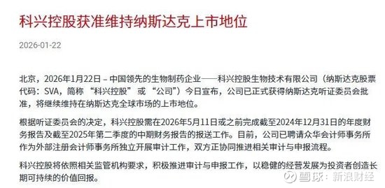 1月22日,科兴控股生物技术有限公司在官网放出公告,在经过听证手续之后,科兴退市危机宣告解除,科兴获批将继续维持在纳斯达克上市地位。
