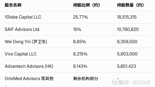 第四大股东为维梧资本Vivo Capital LLC,持股8.215%(约590.3万股)