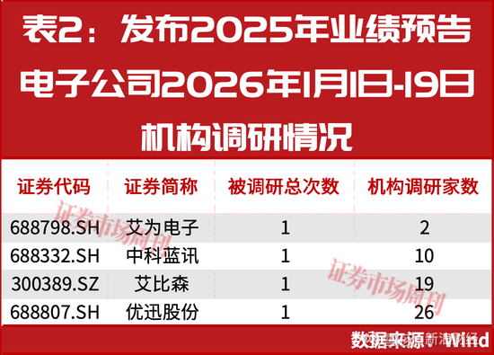 从机构调研来看,2026年1月以来至19日,已发布2025年业绩预告的37家电子行业公司中,仅艾为电子、中科蓝讯、艾比森、优迅股份获得机构调研,调研次数均为1次(见表2)。