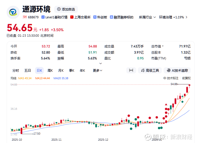 1月23日,安徽上市公司通源环境(688679.SH)股价再度大幅上涨,盘中报54.65元/股,涨幅达3.50%,创历史新高。回溯本轮行情,自1月9日起,这家科创板企业的股价便开启快速攀升模式。1月12日,通源环境股价直线涨停(20%);1月13日,该公司因连续三日涨幅偏离值达30%登上龙虎榜。截至目前,公司股价累计涨幅已达111.74%。