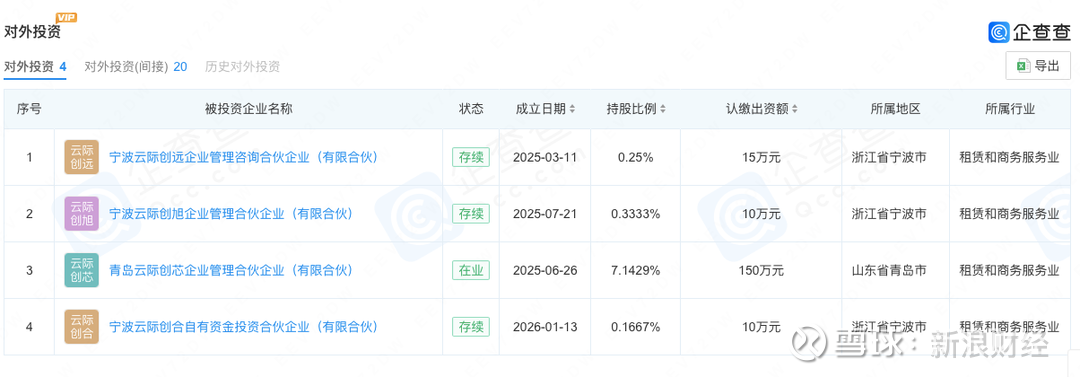 2024年11月,王伟修家族的资本平台山东中际投资控股有限公司(下称“中际投资”),认缴出资7000万元投向烟台源禾股权投资基金管理有限公司旗下产品。2025年,中际投资又与王晓东合资成立了上海云际天泽企业管理有限公司(下称“云际天泽”),此后,中际投资、云际天泽与王晓东陆续合资成立了4家合伙企业。
