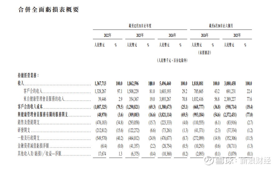 业绩层面同步爆发,微医控股健康管理会员服务收入从2023年的3.54亿元飙升至2024年的38.93亿元,增长近十倍,2025年上半年再增131.4%至23.89亿元。在该业务拉动下,整体营收从2022年的13.68亿元增加至2024年的54.96亿元,2025年上半年营收30.8亿元,同比增长69.4%。