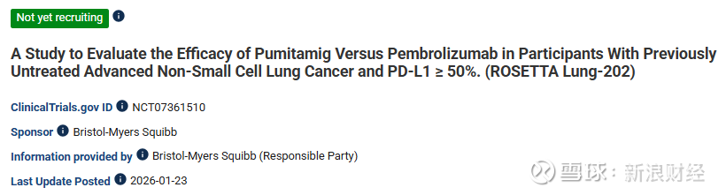1月23日,美国临床试验收录网站显示,百时美施贵宝(BMS)就PD-L1/VEGF-A双抗Pumitamig启动了两项新的III期临床试验(ROSETTA Lung-201和ROSETTA Lung-202)。