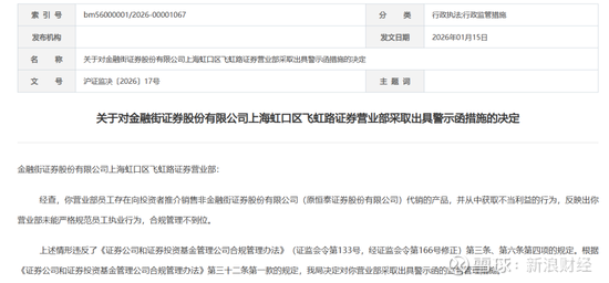 下发于今年1月15日的沪证监决〔2026〕17号监管函显示,金融街证券上海虹口区飞虹路证券营业部(简称:飞虹路营业部)员工存在向投资者推介销售非本公司代销的产品,并从中获取不当利益的行为。反映出该营业部未能严格规范员工执业行为,合规管理不到位。